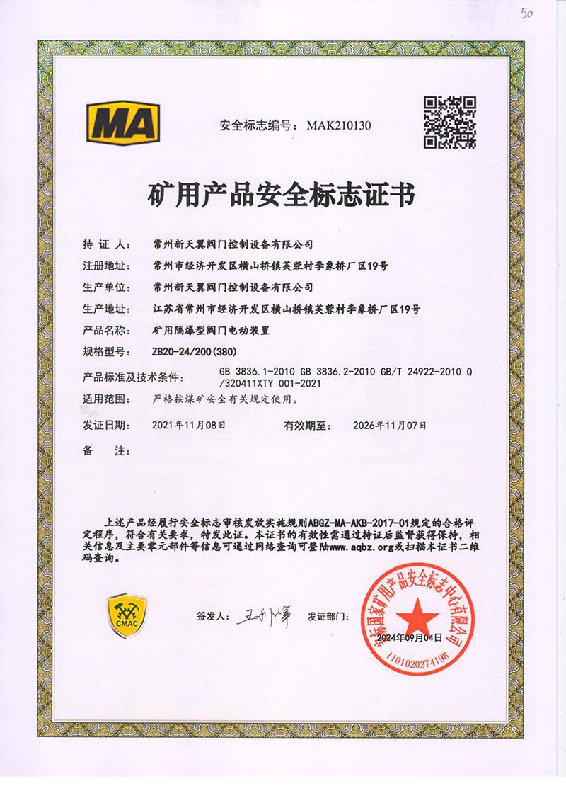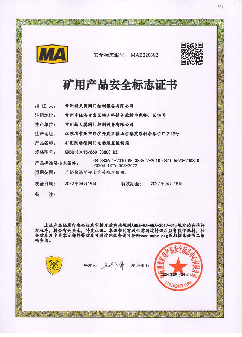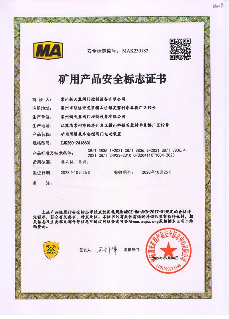 礦用產(chǎn)品安全標(biāo)志證書ZJK180-24(380)