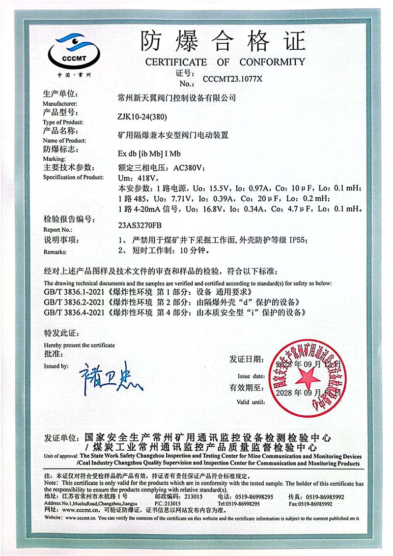 礦用產(chǎn)品安全標(biāo)志證書ZJK10-24(380)