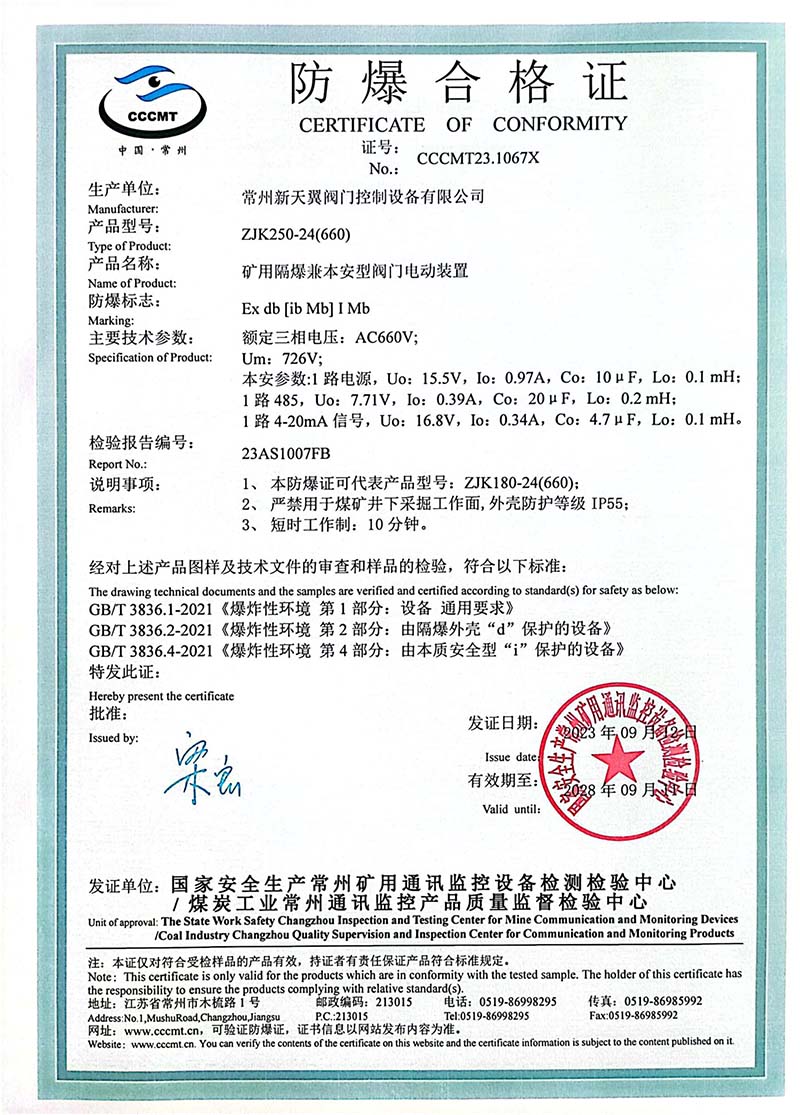 礦用產(chǎn)品安全標(biāo)志證書ZJK250-24(660)