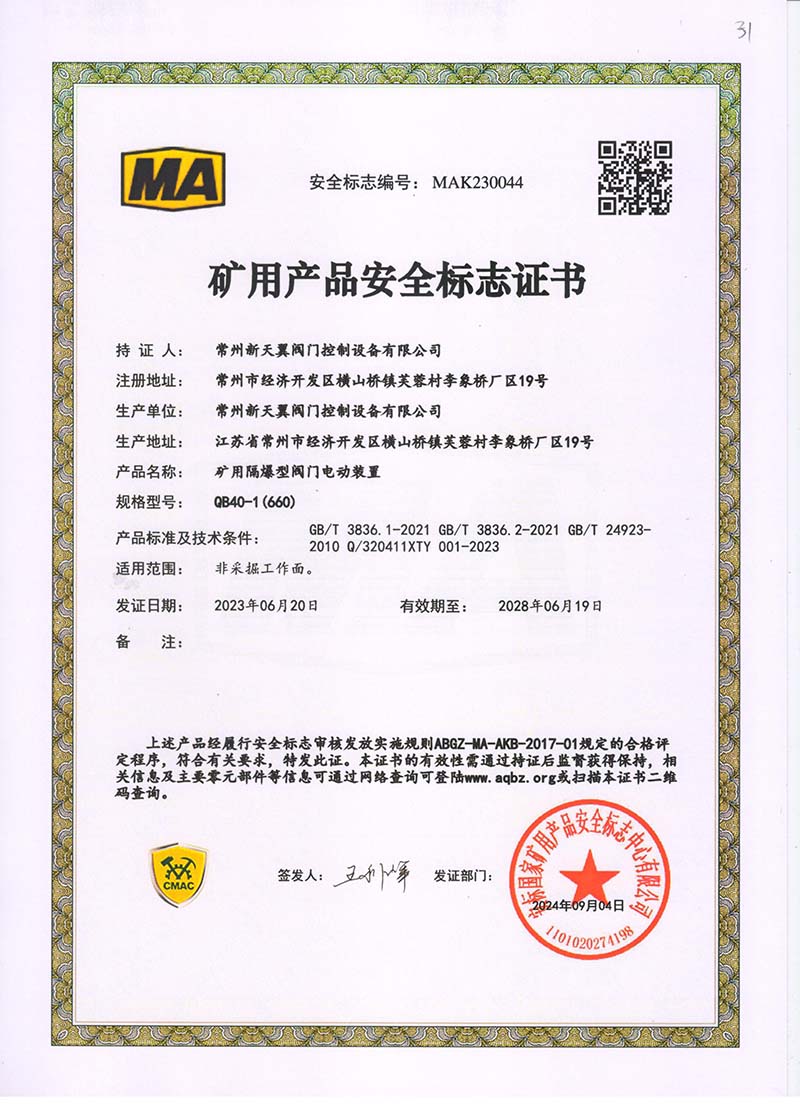 礦用產(chǎn)品安全標(biāo)志證書QB40-1(660)