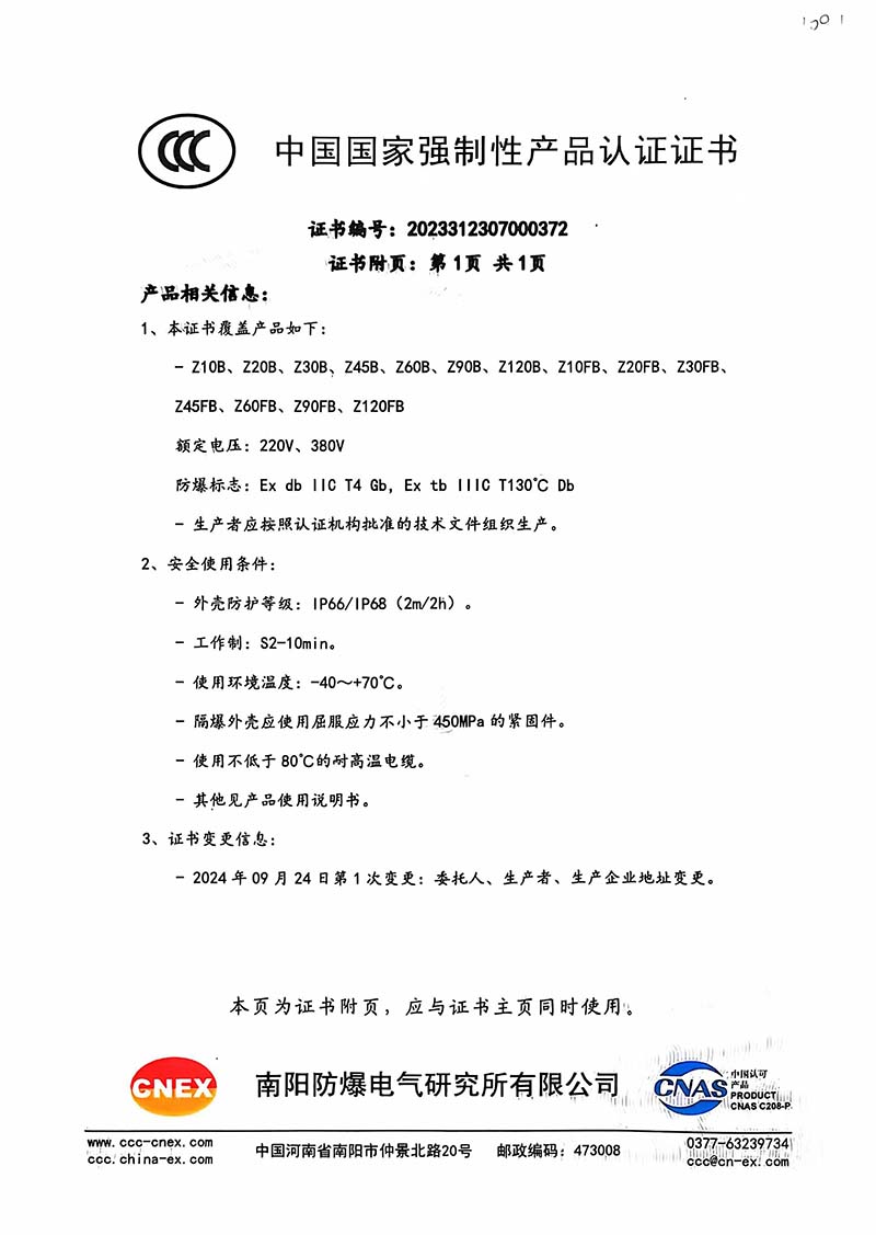 防爆Z10B Z10FB國家強(qiáng)制性產(chǎn)品認(rèn)證CT4證書109.1